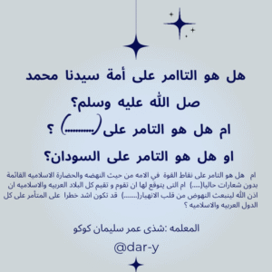 ام هل هو التامر على نقاط القوة في الامه من حيث النهضه والحضارة الاسلاميه القائمة بدون شعارات حاليا(…..) ام التى يتوقع لها ان تقوم و تقيم كل البلاد العربيه والاسلاميه ان اذن الله لينبعث النهوض من قلب الانهيار(……..) قد تكون اشد خطرا على المتامر على كل الدول العربيه والاسلاميه ؟